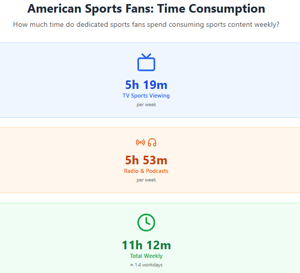 Sports fans consume an additional 5 hours and 53 minutes of sports content through radio and podcasts weekly, according to Edison Research. Combined, this means dedicated fans are spending over 11 hours per week—nearly a full workday—consuming sports content.