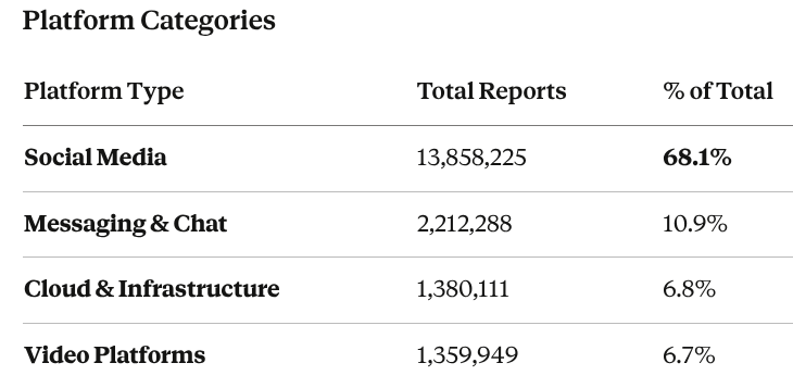 More than two-thirds of all reports come from social media platforms, where children spend significant time connecting with peers, sharing content, and building online identities.