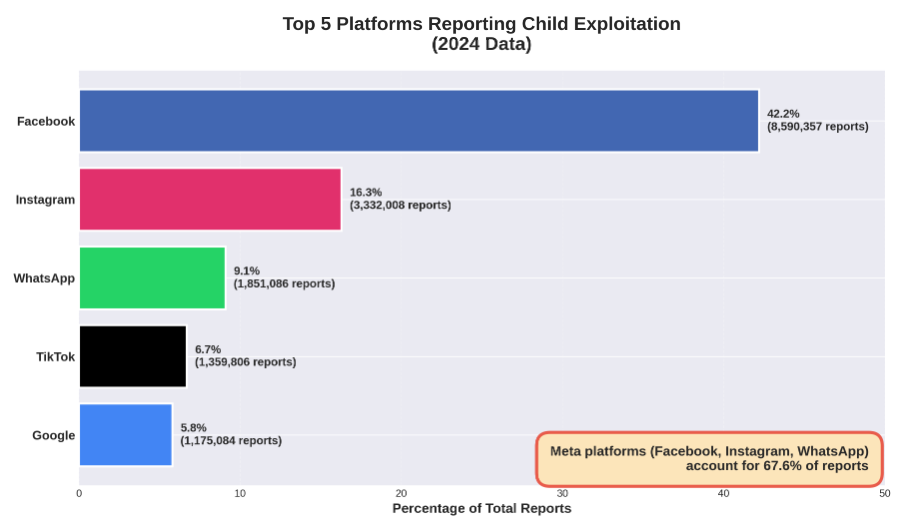 Meta's platforms (Facebook, Instagram, and WhatsApp) alone account for 67.6% of all reports. This concentration raises important questions about platform design, content moderation, and child safety features.