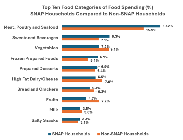 The top 10 food categories purchased are largely the same between SNAP and non-SNAP households—just ranked in slightly different orders. SNAP households spend slightly more on meat/seafood, sweetened beverages, and prepared foods, while non-SNAP households spend slightly more on vegetables and fruits.
