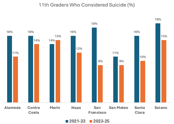 Even more encouraging, the data shows meaningful declines in suicidal ideation. Seven of eight counties saw decreases in students reporting they considered suicide:
