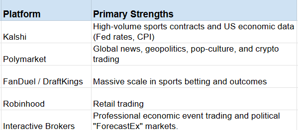 Even banned sportsbooks like FanDuel and DraftKings entered via prediction market platforms (launched late Dec.)