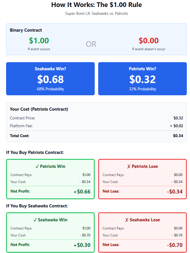 In a prediction market, participants are essentially buying a financial contract tied to whether an event happens or not. The mechanics are simple: every contract is worth either $1.00 or $0. The price paid reflects the market's probability that the event will occur. Using the Super Bowl as an example—one could buy a Seahawks contract at $0.68 or a Patriots contract at $0.32. Here's how the game contracts work: