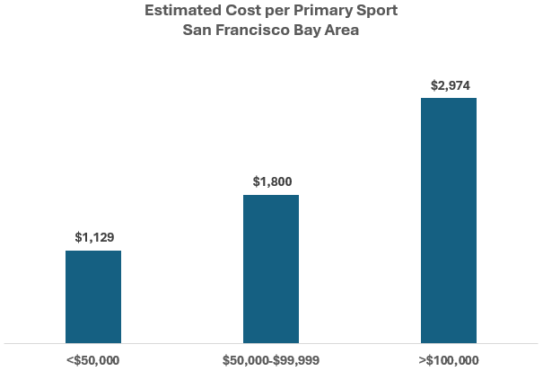 Bay Area families with annual incomes less than $50,000 spend an average of $1,129 per year on a child's primary sport. In contrast, the wealthiest families—those with annual incomes exceeding $100,000—spend an average of $2,974 per year. This more than 2.5-times difference in spending highlights the substantial disparity in resources allocated to youth sports across income brackets.