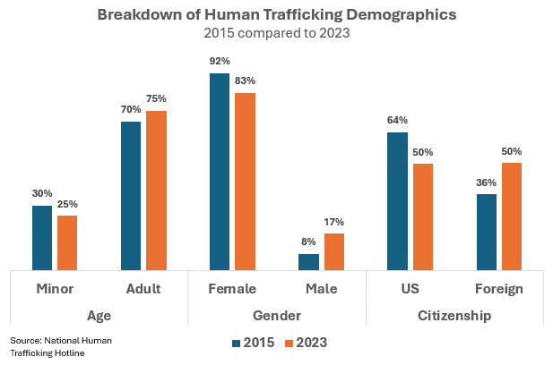 Trafficking victim profiles have shifted notably in recent years. As percentages of total reported cases: