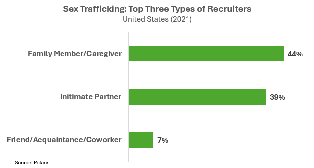 Most traffickers are known to their victims, with family members (44%) and intimate partners (30%) representing the majority of recruiters.